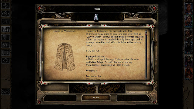 Воры. Тут в игре совсем плохо: два мага, задуаленных из воров (откровенная пакость, применять как вора не рекомендуется), техно-маг в лице гнома (плохие навыки компенсируются хорошими шмотками, а прятаться он и не желает, вполне обоснованно считая, что магическая невидимость лучше) и классный настоящий вор Yoshimo, оказывающийся впоследствии предателем. Выбор за вами.